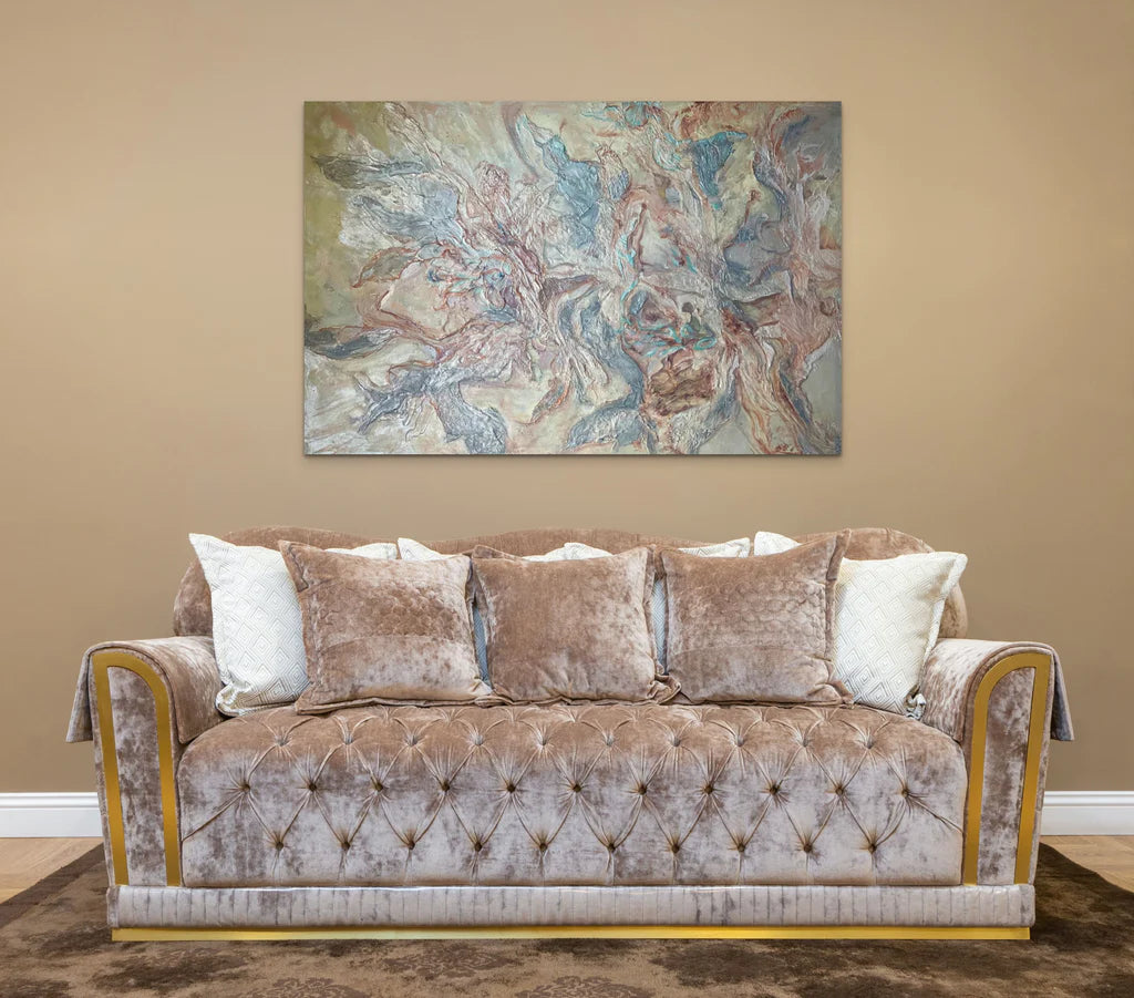 Soft petals emerge from textured layers, unfolding like dancers caught mid-motion. Flowering Dance evokes the rhythm of growth—an abstracted bloom reaching outward in a graceful, earthy waltz. Hints of turquoise and rose whisper through the organic forms, suggesting the tender power of transformation and the quiet poetry of nature in motion.