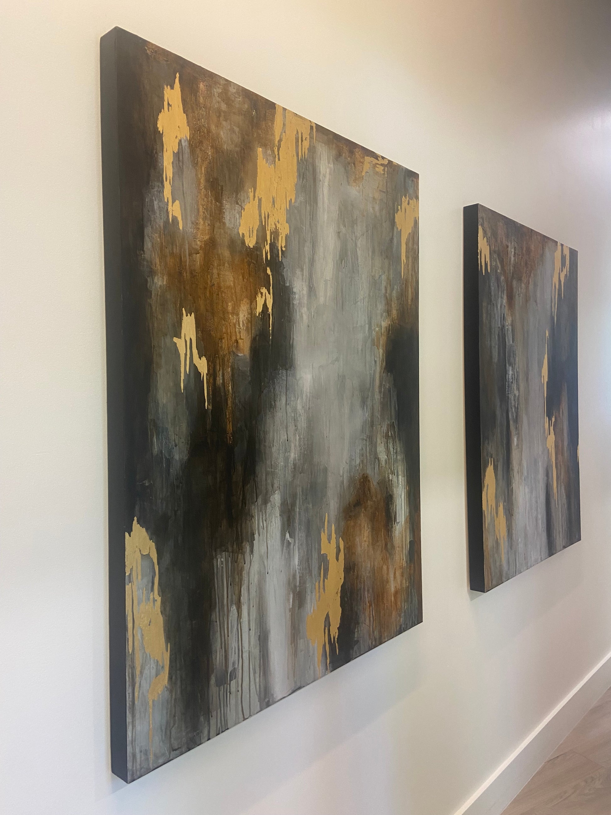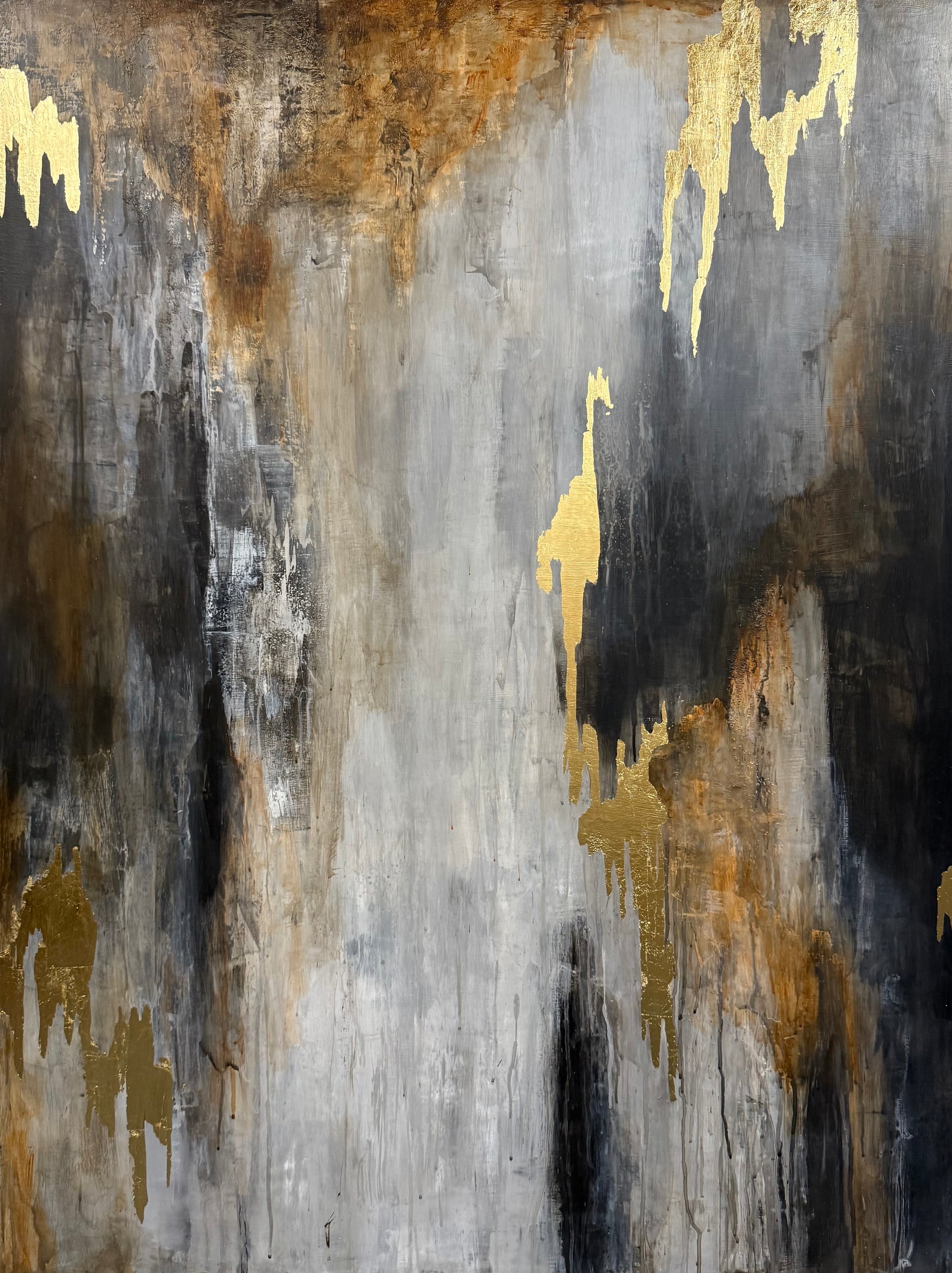 Abstract mixed media on board in black white and gold leaf. This piece measures 36x48x2” with black sides. Artist Kelly Dillard is featured by ArtVia Design at BLOWNAWAY in Southlake.